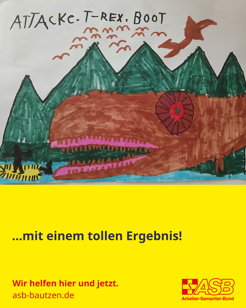 Malen & Zeichnen sind seine absolute Lieblingsbeschäftigung – und gestern ist dabei das Bild „Attacke T-Rex Boot“ in unserer Tagesgruppe in Bautzen entstanden.